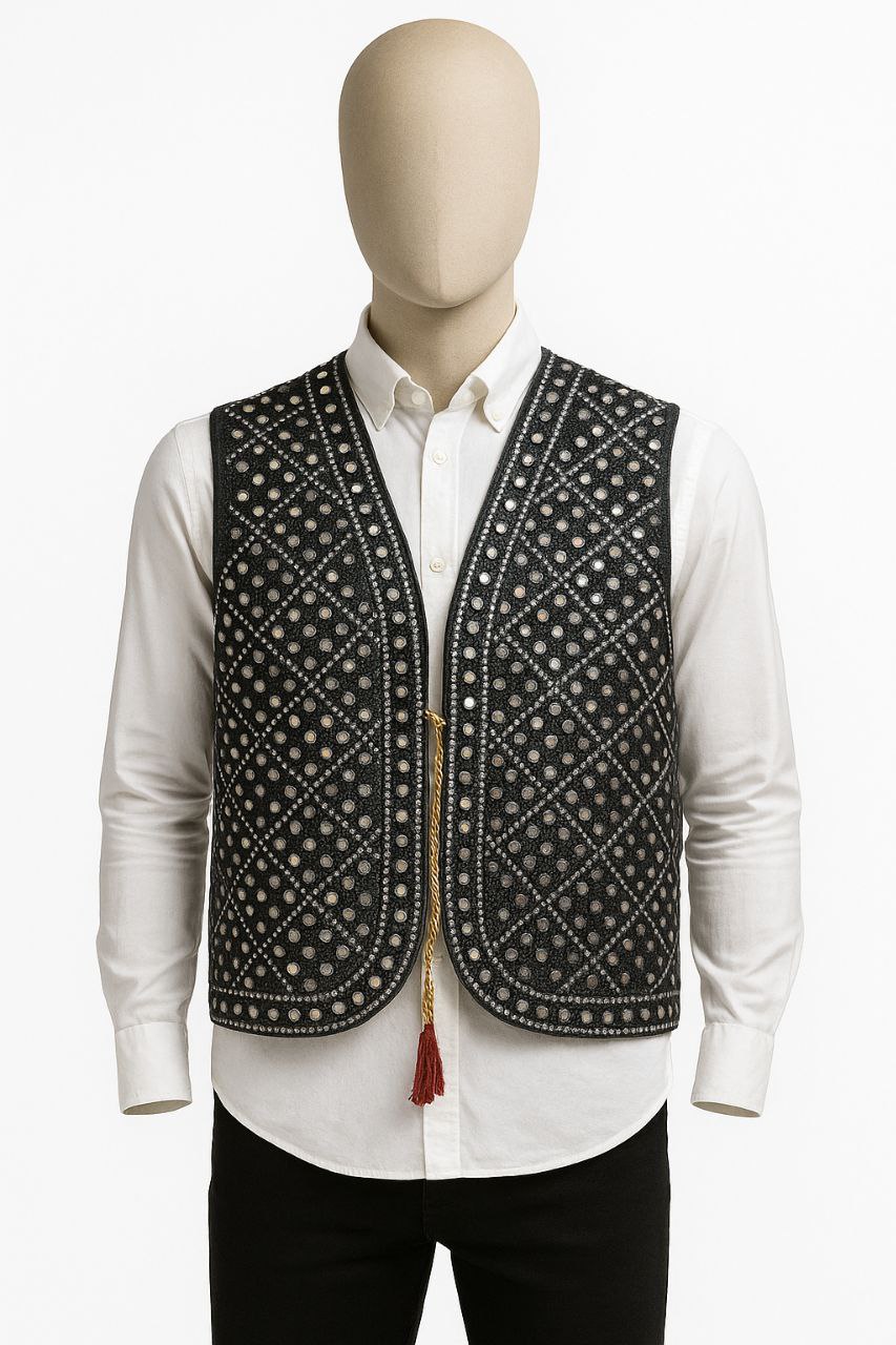 این جلیقهی سنتی مردانه با زمینهی مشکی و دوختهای منظم نقرهای، ترکیبی از سادگی و شکوه را به نمایش میگذارد.