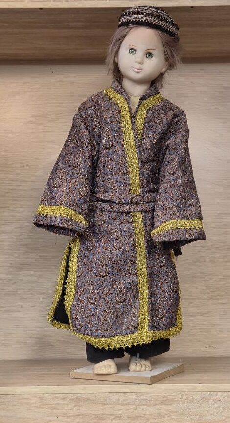 این لباس سنتی پسرانه با طراحی اصیل و پارچه‌ای نفیس، جلوه‌ای از فرهنگ و هنر ایرانی را به نمایش می‌گذارد.