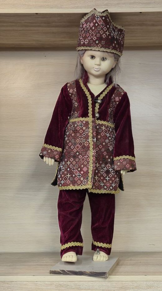 این لباس سنتی پسرانه، جلوهای باشکوه از پوشاک اصیل ایرانی است که با ترکیبی از پارچهی مخمل و نقشهای هندسی سنتی طراحی شده است.