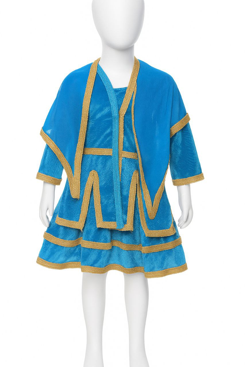 این لباس سنتی زیبا با ترکیب رنگ آبی لاجوردی و طلایی، نمایانگر جلوه‌ای باشکوه و شاد از پوشاک آیینی ایرانی است. پارچه‌ی آن از جنس براق و سبک انتخاب شده که در نور درخشش خاصی دارد و برای جشن‌ها و رقص‌های محلی بسیار مناسب است.