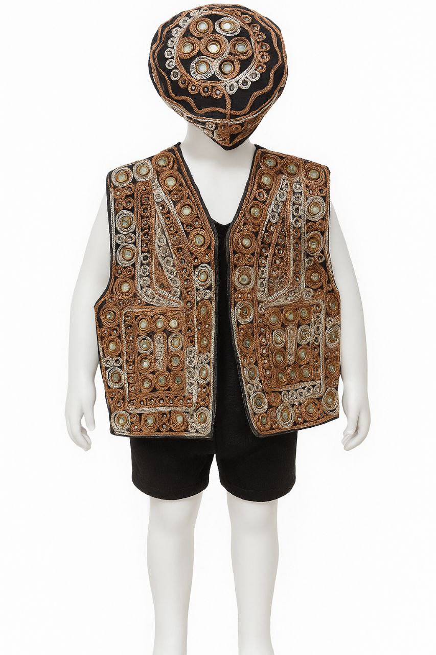 این لباس سنتی زیبا شامل جلیقه و کلاه دست‌دوز با تزئینات برنزی و نقره‌ای است که با درخشش آینه‌کاری‌ها و دوخت‌های برجسته، جلوه‌ای باشکوه و آیینی دارد.