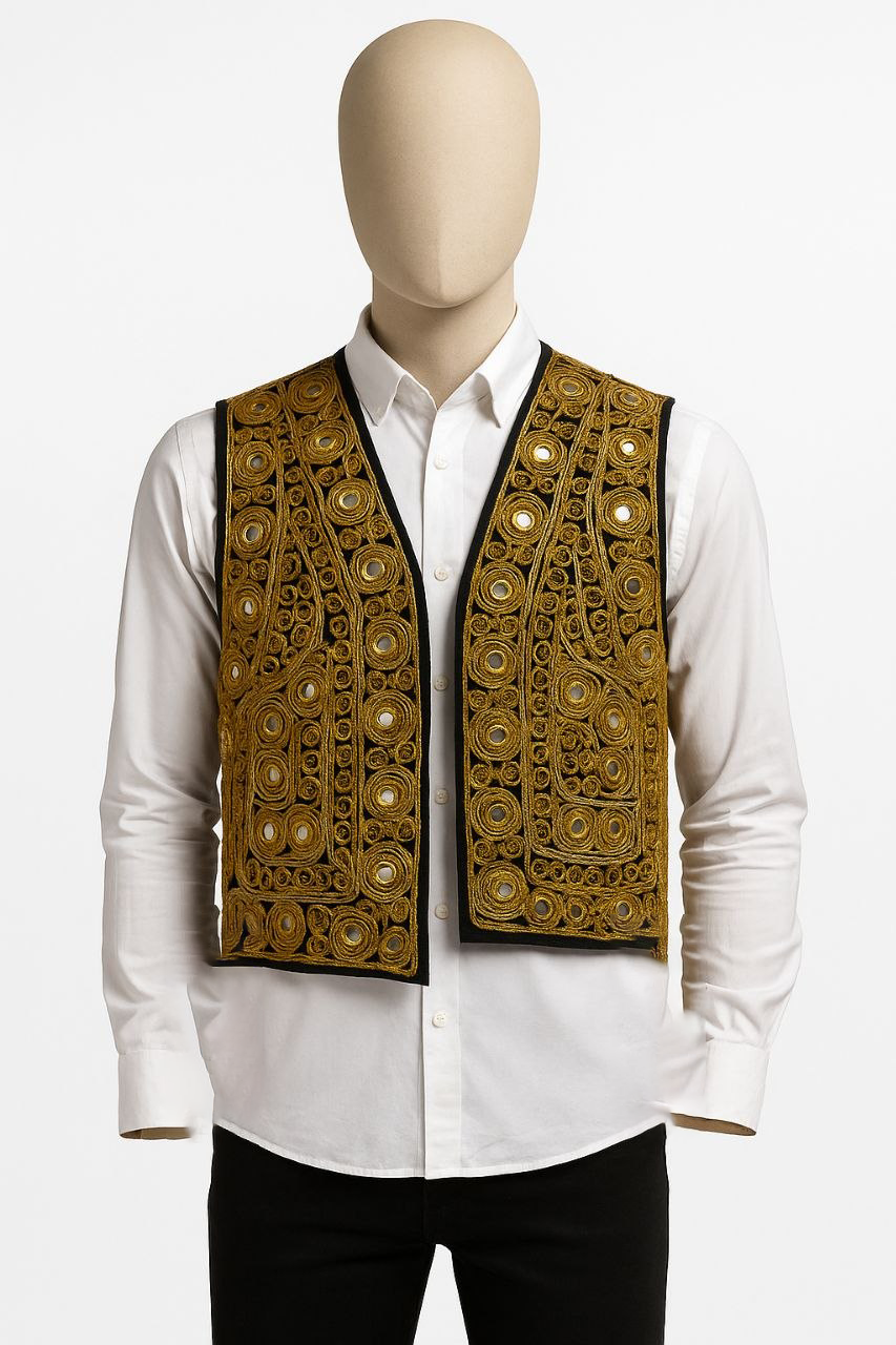 این جلیقهی سنتی مردانه با دوختهای طلایی برجسته بر زمینهی مشکی، نمادی از شکوه و هنر اصیل ایرانی است.
