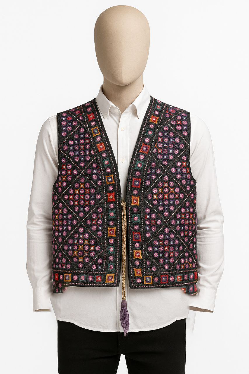 این جلیقهی سنتی مردانه با طرحهای هندسی و رنگارنگ، جلوهای خاص و چشمنواز دارد.