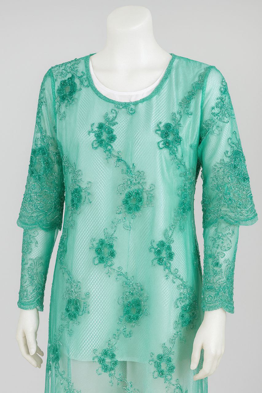 لباس از پارچه‌ای تور و ارگانزای نیمه‌شفاف دوخته شده که روی آن با نقوش گل‌دوزی و منجوق‌دوزی سبز براق تزئین شده است. گل‌ها به صورت منظم در سراسر لباس پخش شده‌اند و جلوه‌ای سه‌بعدی به آن بخشیده‌اند. آستین‌ها نیز با همین نقش‌ها پوشیده شده و طرحی هماهنگ با تن‌پوش ایجاد کرده‌اند.